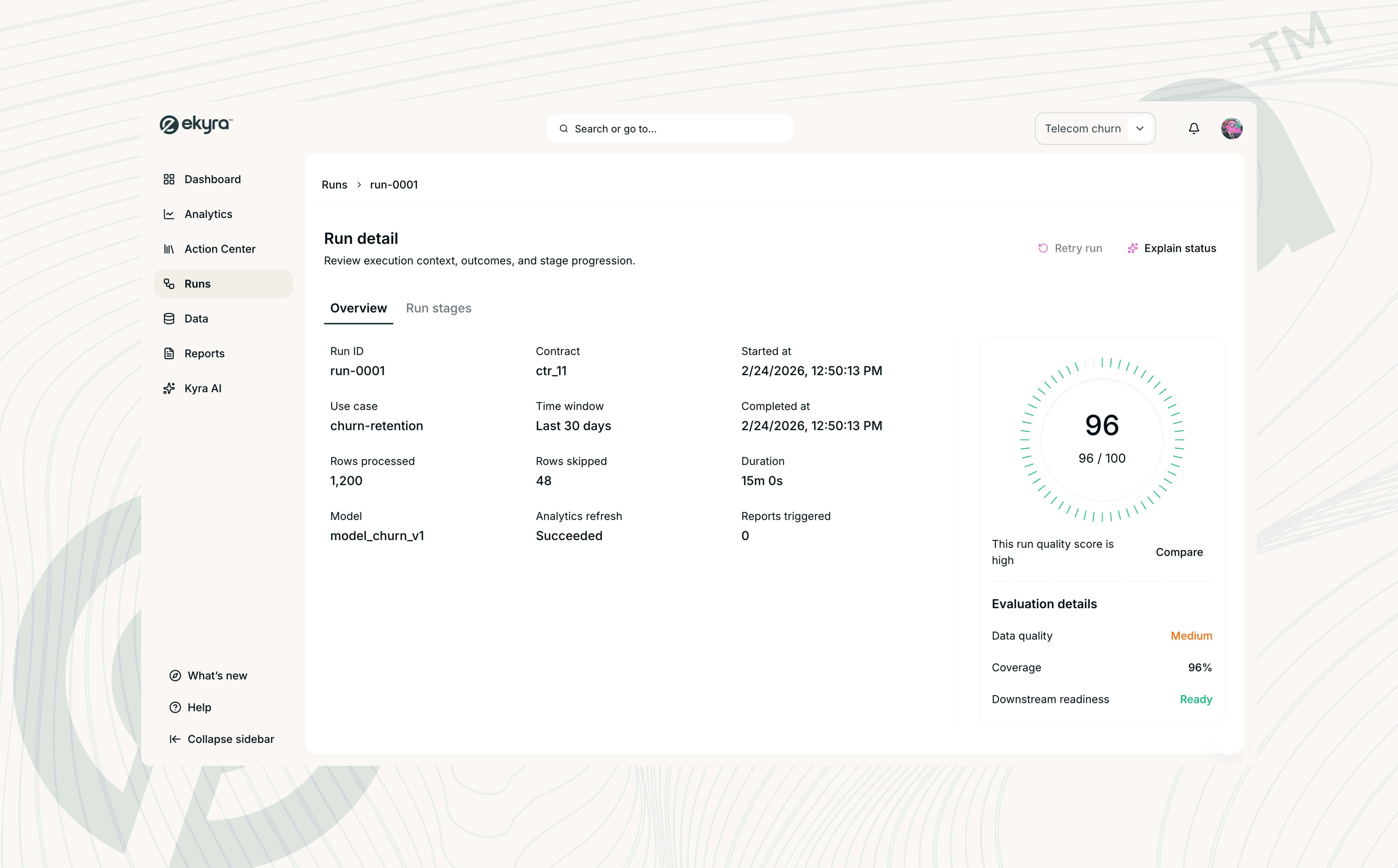 A Ekyra é uma plataforma de IA vertical orientada para BI, concebida para ajudar as equipas a detetar risco mais cedo, priorizar as ações certas e medir o impacto no negócio num único fluxo de trabalho.